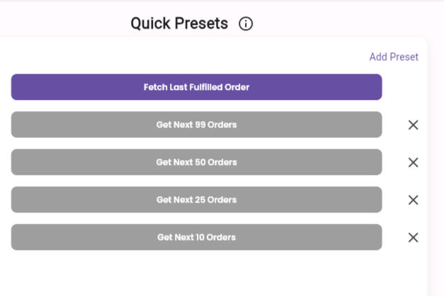 Quick Presets helps you get your last order, and then the next number of orders, whether it's 10 orders, or 99 orders.