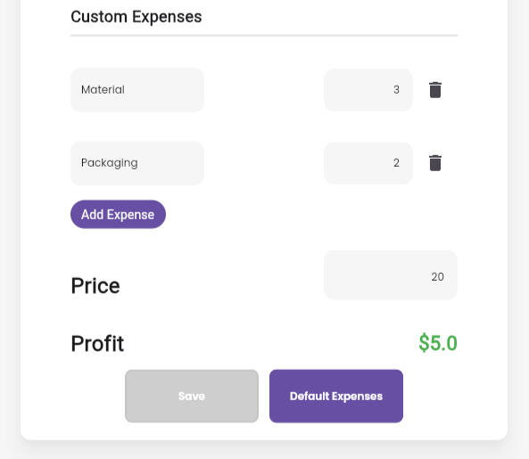 You can list all of your expenses, and put them against the price you charge to find out your profit. We also have the ability to add default expenses.